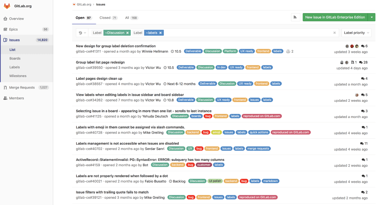 Labels allow you to categorize issues or merge requests using descriptive titles like bug, feature request, or docs. Each label also has a customizable color. They allow you to quickly and dynamically filter and manage issues or merge requests you care about, and are visible throughout GitLab in most places where issues and merge requests are located.