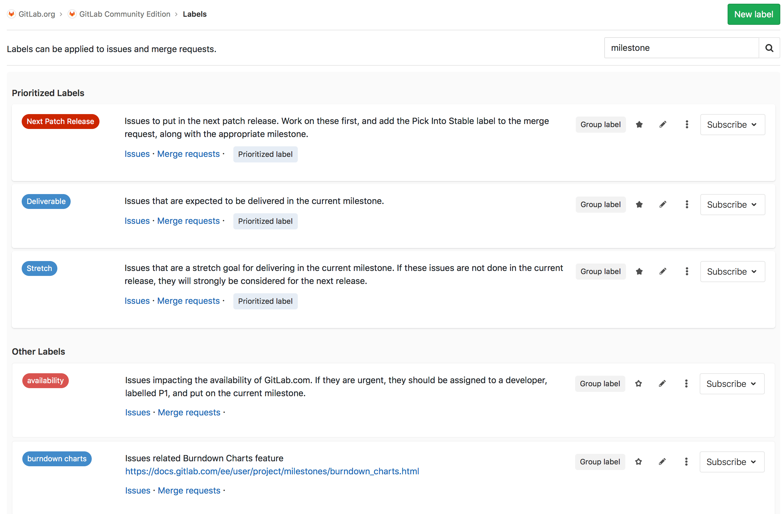 From the project label list page, star a label to indicate that it has a priority. Drag starred labels up and down to change their priority. Higher means higher priority. Prioritization happens at the project level, only on the project label list page, and not on the group label list page. However, both project and group labels can be prioritized on the project label list page since both types are displayed on the project label list page.